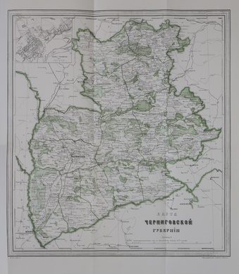 Карта Черниговской губернии Российской Империи из сборника материалов, собранных офицерами генерального штаба царской армии и изданного в 1865 году. Отдельно на карте представлен план города Чернигов. Материалы переданы в РВИО из личной библиотеки.