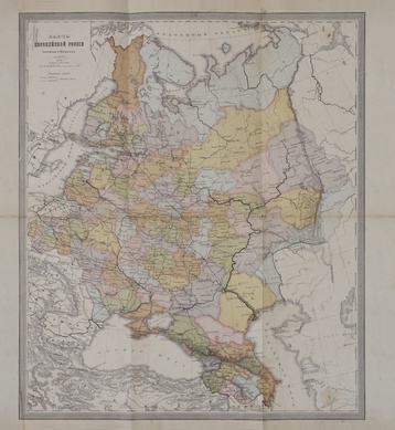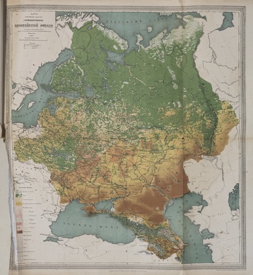 Карты Российской Империи из Учебного географического атласа полного гимназического курса за авторством Ильина, изданного в 1878 году в Санкт-Петербурге. Представленные материалы содержат подробную информацию об особенностях этнографического расселения на территории Российской Империи, а также информацию о состоянии железнодорожной инфраструктуры и важнейших отраслей промышленности в европейской части Российской Империи. Кроме этого, на отдельной карте представлена информация о расположении населенных пунктов и связующей их дорожной инфраструктуре в азиатской части Российской Империи. Материалы переданы в РВИО из личной библиотеки гражданина.