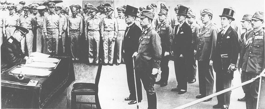 Генерал Макартур открывает церемонию. Он скуп на слова: по-военному кратко, одной фразой изложил суть происходящего. Первым к столу подошел, волоча протез и опираясь на палку, Сигэмицу. Он во фраке, лицо бледное, неподвижное. Сигэмицу медленно сел и сделал запись в акте о безоговорочной капитуляции: «От имени императора и правительства и по их приказу. Мамору Сигэмицу». Поставив подпись, он на какое-то время задумался, словно взвешивая значение совершенного им акта, затем с трудом поднялся, поклонился в сторону генералов и заковылял на свое место.
