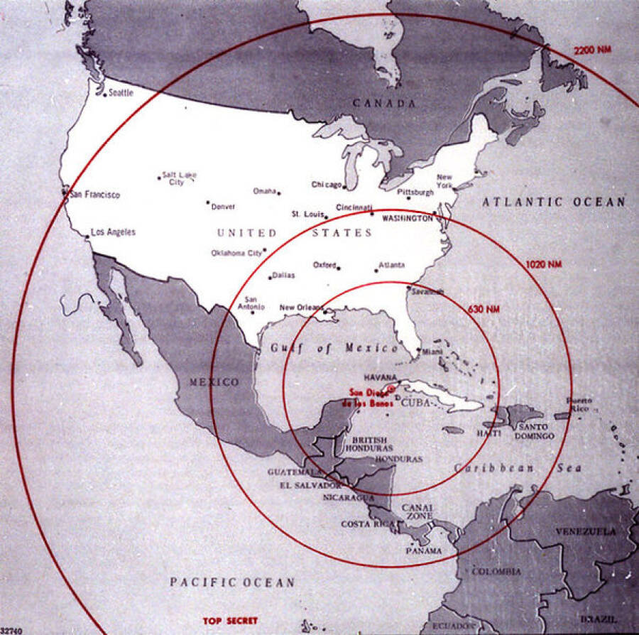 Обложка: Карта Северной Америки, показывающая весь спектр ядерных ракет, строящихся на Кубе, которые использовались во время секретных совещаний по кубинскому кризису. Эта карта использовалась на секретных встречах во время Карибского кризиса. Карта ранее была совершенно секретной. 1962.
