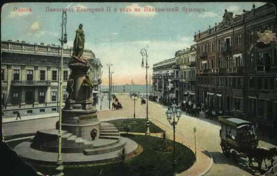 Обложка: Открытка начала XX века с видом на Екатерининскую площадь и Николаевский бульвар в г. Одесса. Памятник основательнице города Екатерине II.