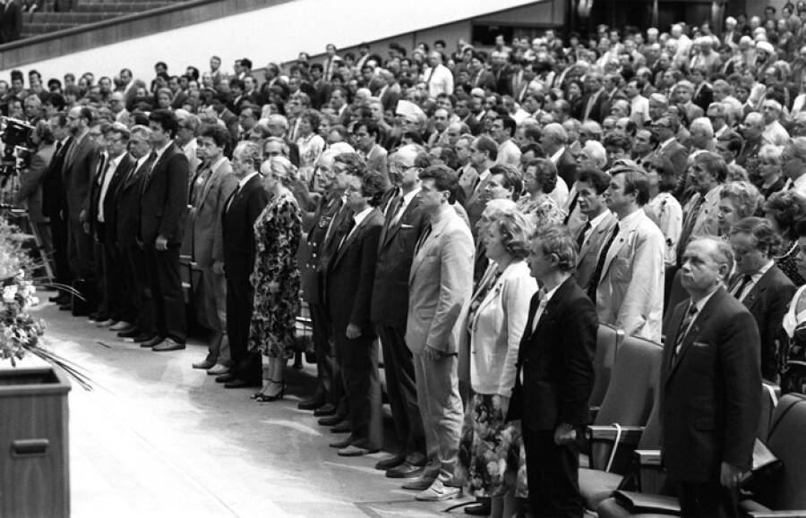 Сегодня на Съезде присутствует 2155 народных депутатов СССР из 2249 избранных. Подробные данные о результатах выборов, о составе депутатов доложит Мандатная комиссия, которую изберет Съезд и которой Центральная избирательная комиссия передаст всю документацию, необходимую для проверки полномочий депутатов.