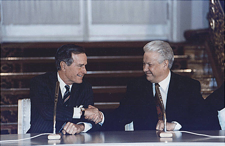 3 января 1993 г., еще до вступления в должность новоизбранного президента, Дж.Буш-старший посетил Москву. В ходе его визита был подписан российско-американский Договор о дальнейшем сокращении и ограничении стратегических наступательных вооружений (СНВ-2, START II). При подписании стороны исходили из того, что договор вступит в силу после того, как Украина, Белоруссия и Казахстан ратифицируют договор СНВ-1 от 1991 г. и присоединятся к Договору о нераспространении ядерного оружия в качестве неядерных государств. Договор предусматривал сокращение к январю 2003 г. числа ядерных боеголовок у России и США до 3500 единиц.