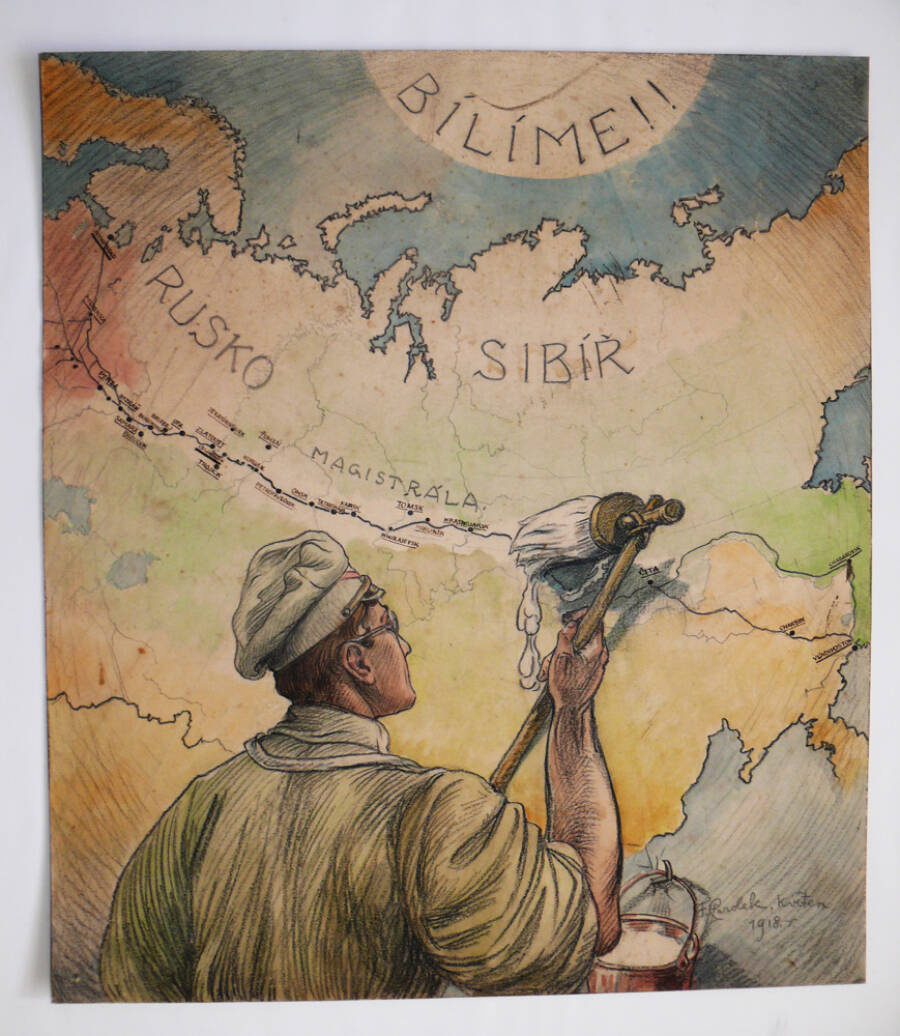 Обложка: Плакат «Чехословацкий боец «отбеливает» Россию в районе Транссибирской магистрали». František Parolek, 1918 г.