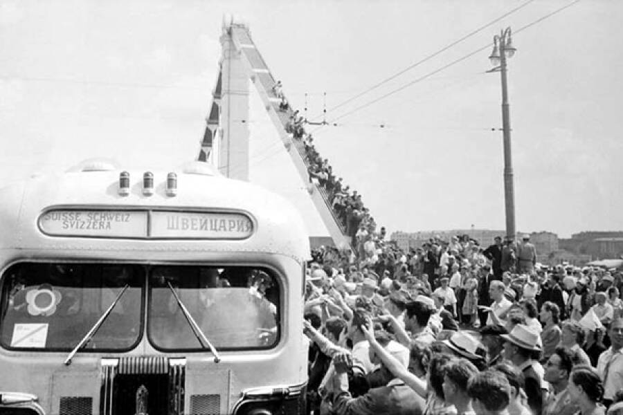 Фестиваль ехал по Москве в автобусах и в открытых грузовиках (на всех гостей автобусов не хватало). Он плыл по Садовому кольцу, которое представляло собой бескрайнее человеческое море. Вся Москва, простецкая, только-только пришедшая в себя после военных карточек и очередей, еще не забывшая о борьбе с космополитизмом и низкопоклонством, кое-как приодевшаяся, едва начавшая выбираться из подвалов и коммуналок, стояла на мостовой, тротуарах, крышах домов и тянула к проезжающим гостям руки, истосковавшиеся по пожатию таких же теплых человеческих рук. Географическая карта обрела конкретное воплощение. Мир действительно оказался потрясающе разнообразен. И в этом многообразии рас, характеров, языков, обычаев, одежд, мелодий и ритмов - поразительно един в желании жить, общаться и узнавать друг друга. Теперь такие слова и намерения кажутся банальностью. Тогда, в разгар "холодной войны" они воспринимались как необычайное личное открытие. Наша страна открывала мир, приобщаясь ко всему роду человеческому. А мир открывал нашу страну... Не помню, ел ли я что-то в те дни и ложился ли спать. Я просто был счастлив. Все 14 дней, с утра и до вечера.