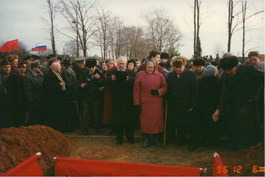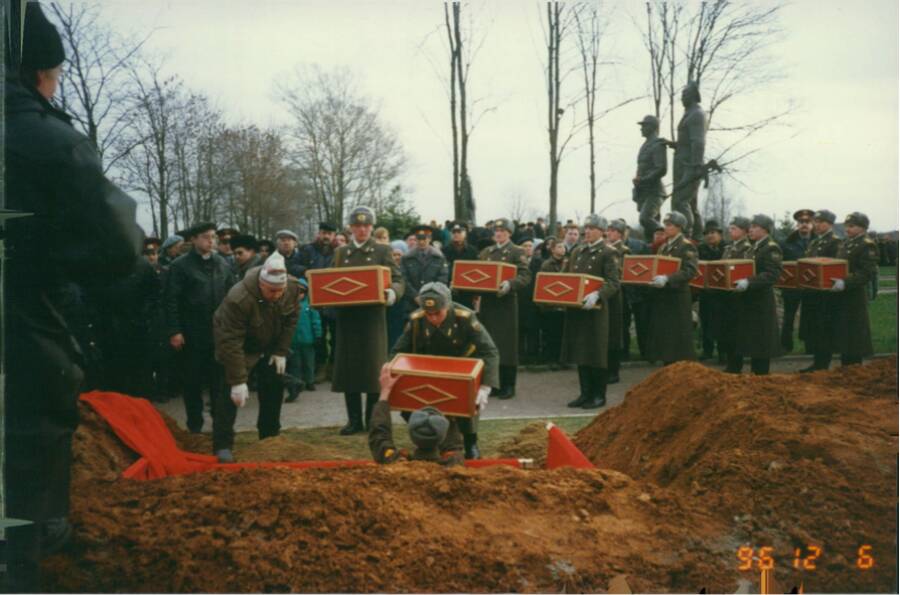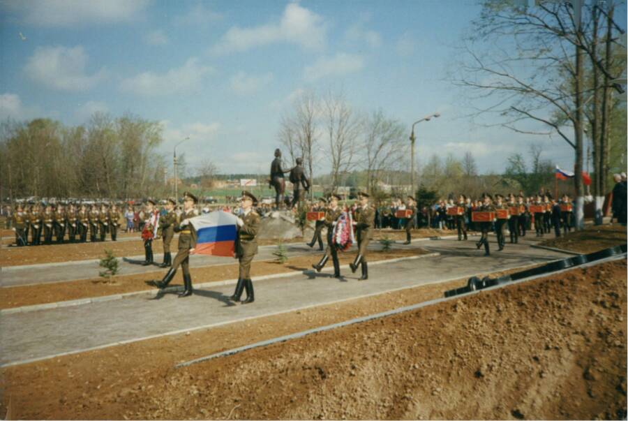 Торжественная церемония захоронения героев состоялась 6 декабря 1996 года. В ней приняли участие рота почетного караула Президентского полка Комендатуры Московского Кремля и курсанты Голицинского пограничного института ФСБ России. Были вынесены боевые знамена 1, 2, 3 и 4-й гвардейских стрелковых дивизий, а также боевое знамя 9-й гвардейской стрелковой дивизии, останки солдат которой, погибших при освобождении г. Истры, были обнаружены поисковиками в 1996 году.