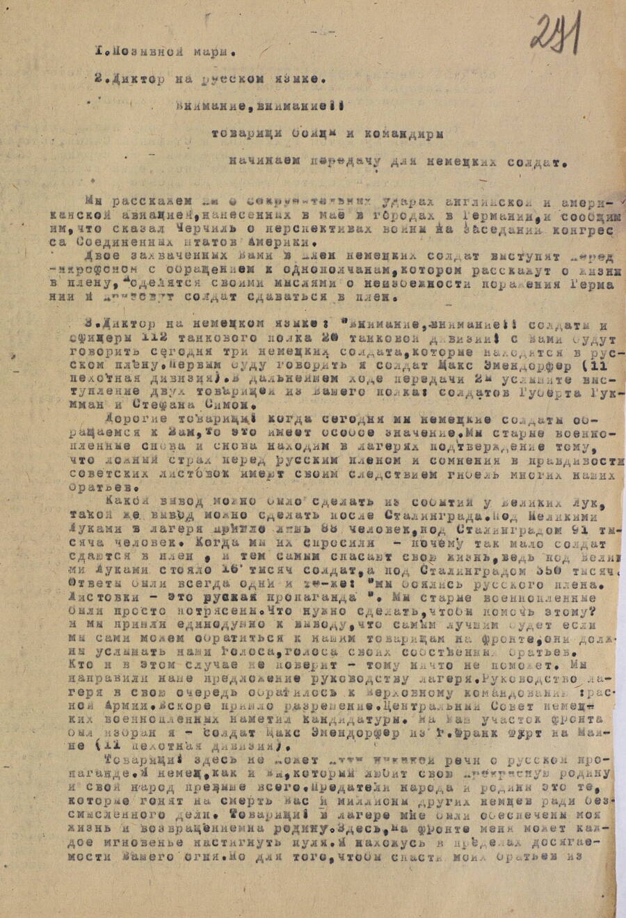 Проведенный органами спецпропаганды ПУ фронтов в мае 1943 года анализ показал, что немцы активно интересуются нашими устными передачами и печатными изданиями. Из материалов допросов военнопленных: