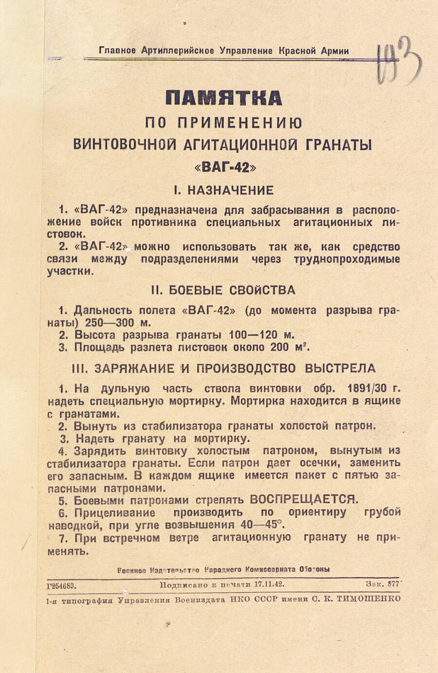 В 1943 году промышленность Советского Союза начала поставлять в войска ВАГ-42, которые предназначались для забрасывания специальных агитационных листовок в расположение противника, а также могли использоваться как средства связи между подразделениями. Граната снаряжалась 35 листовками. Дальность полета гранаты 250–300 метров. При этом площадь разлета листовок около 200 кв.метров[1].