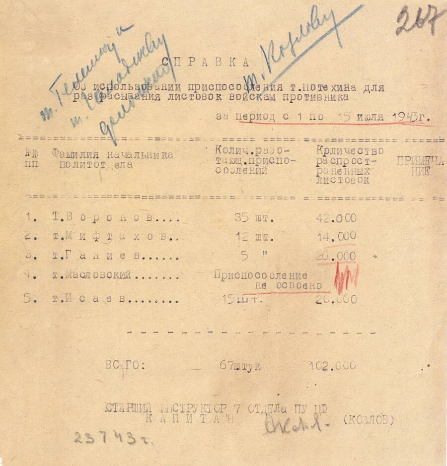 В своем докладе от 10 августа 1943 г. № 0283 начальнику 7 отдела ГлавПУРККА о результатах засылки военнопленных в расположение противника начальник 7 отдела ПУ ЦФ отмечает: