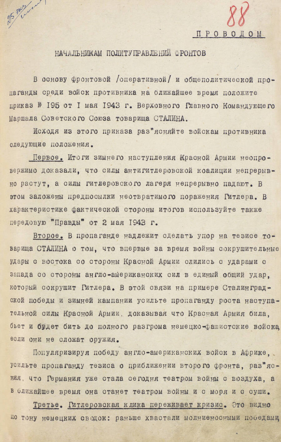 Летняя кампания 1943 года была очень важна для осуществления коренного перелома в ходе войны. Поэтому 1 мая Верховный Главнокомандующий подписывает приказ № 195, в котором, наряду с первомайскими поздравлениями, подводятся итоги зимней кампании 1942–1943 гг., говорится об успешной ликвидации противника под Сталинградом, изменении хода мировой войны и создании необходимой предпосылки для победы над гитлеровской Германией. Приказ явился основополагающим документом для организации агитационно-пропагандистской работы в предстоящей летней кампании[1].