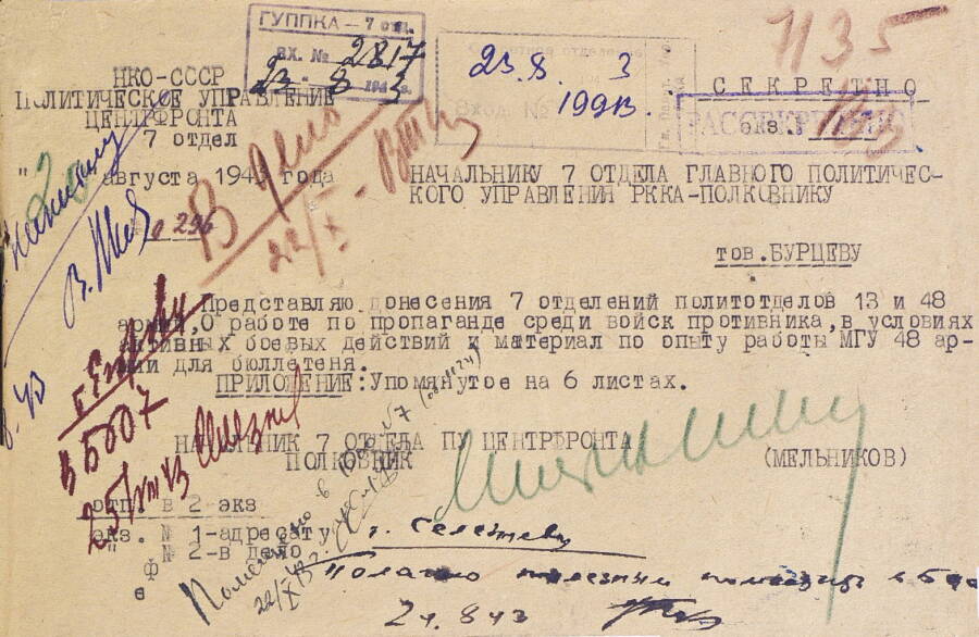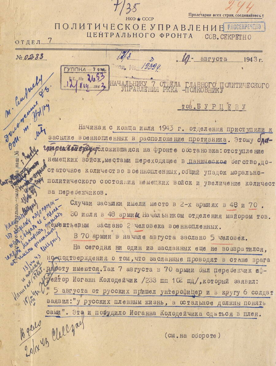 …В 48 армии заслано 2 человека, …в 70 армии заслано 5 человек… подтверждения о том, что засланные проводят в стане врага работу, имеются… Перебежчик ефрейтор Иоган Колодейчик заявил, что 5 августа от русских пришел унтер-офицер и в кругу 6 солдат рассказал: – У русских пленным жизнь, а остальные должны понять сами. Это и побудило сдаться...