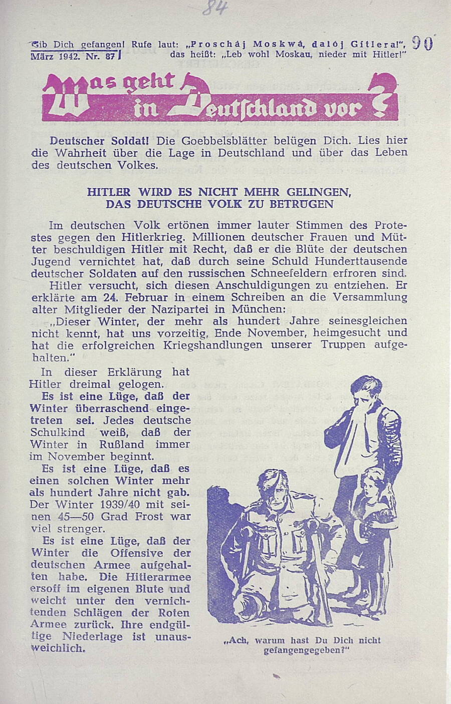 В листовках «Слова и дела Гитлера», «За что вы воюете?», «Что принесет лето 1943 года?», «Ты собрался вернуться в Германию?» разъяснялись истинные цели войны, разоблачалась нацистская клевета. Многие листовки являлись пропуском для сдачи в плен[3].