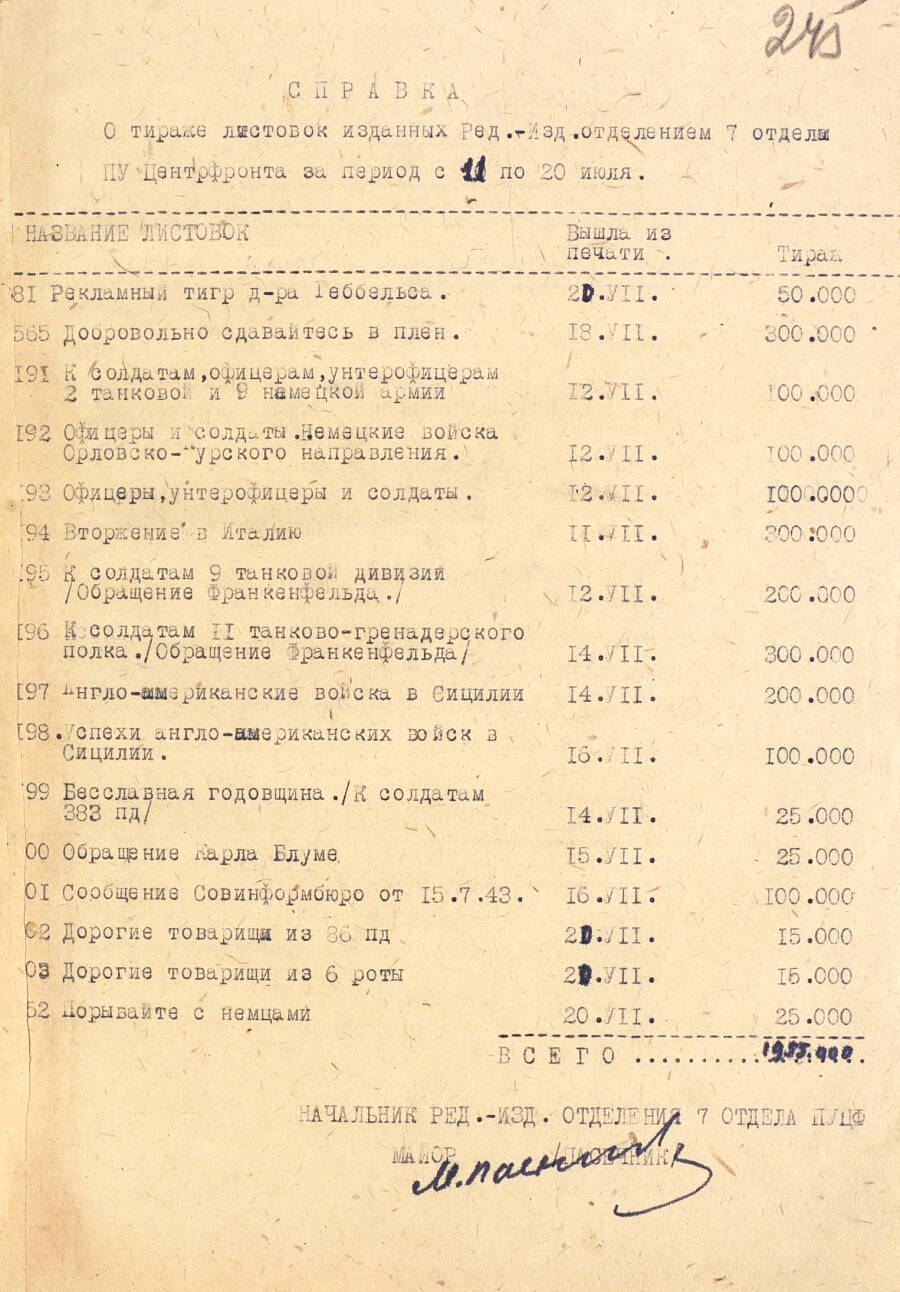 С началом Курского сражения воздействие на противника шло нарастающими темпами. Если в период с 5 по 15 июля 1943 г. политотделами армий и ПУ ЦФ изготовлено 119 500 листовок, то уже с 11 по 20 июля – 1 933 000, а с 21 по 31 июля – 1 735 000.