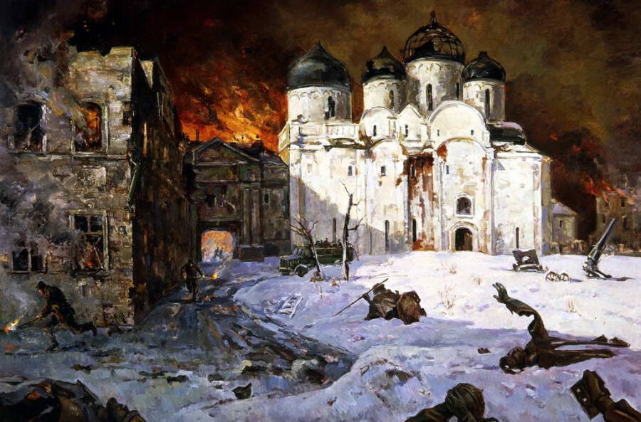 - Немецкая оккупация сопровождалась огромными разрушениями материальных ценностей и лишениями для населения. На территории области располагались два крупных лагеря военнопленных. Оккупационный режим отличался жестокостью: местное население противодействовало захватчикам, поддерживало партизанское движение и почти все оказалось под подозрением в нелояльности. Пострадало и выдающееся культурное наследие региона. Участвовавшая в оккупации испанская дивизия занималась мародерством и грабежами. Город был почти полностью разрушен при захвате, последующих боевых действиях и при освобождении. Старинные монастыри стояли в руинах, бесследно исчезли десятки уникальных икон, рукописей. Были уничтожены все фильмотеки и библиотеки города. С куполов Софийского собора содрали позолоту и крест. А Кремль перед отходом немцы заминировали. К счастью, удалось восстановить памятник «Тысячелетие России», который немцы разобрали по частям и хотели вывезти в Германию…