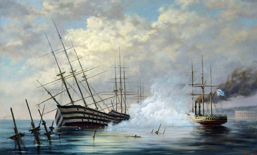 Последние корабли Черноморской эскадры были затоплены при отходе русских войск на северную сторону уже в августе 1855 года. В Севастопольской бухте на дне оказалось в общей сложности 75 боевых кораблей и судов, а также 16 вспомогательных, включая шхуны. Корабли топили под покровом ночи, в них стреляли из пушек. На берегу их провожали экипажи. Матросы плакали, глядя, как их корабли погружались в воду…