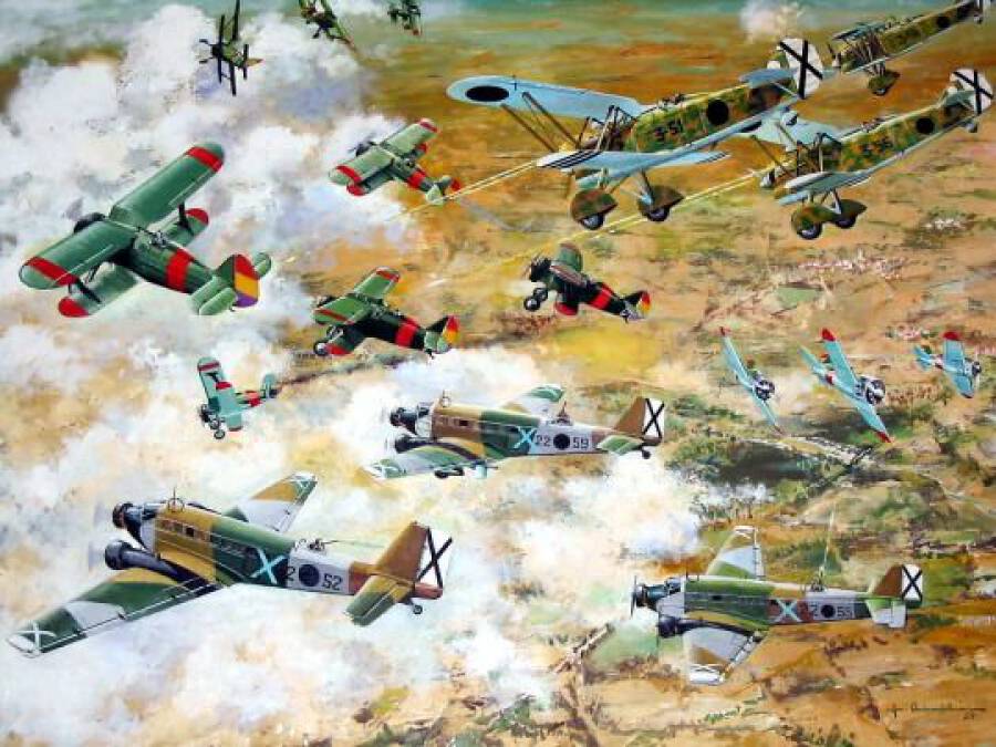 Всего, по данным испанских источников, Советский Союз поставил республиканскому правительству Испании 648 самолетов. В основном это были самые современные на тот момент советские боевые машины, и первыми стали бомбардировщики СБ – в середине сентября 1936 года в Испанию морским путем доставлен 31 самолет. 28 октября того же года прибыли 40 истребителей И-15, чуть позже – первая партия И-16. Истребители из Советского Союза заслужили у испанцев характерные ласковые прозвища: «пятнадцатые» именовались «чато», то есть «курносые», а «шестнадцатые» – «моска», то есть «мушка». А у противника, прежде всего франкистских летчиков и пилотов-итальянцев, «мошки» назывались «рато», то есть «крыса»: очень уж большие неприятности сулила встреча с этими небольшими, но очень верткими и опасными самолетами. Кроме того, воевали в Испании в качестве штурмовиков и легких бомбардировщиков советские бипланы Р-5 и их наследники — бипланы Р-Z, которые испанцы называли «Наташа».