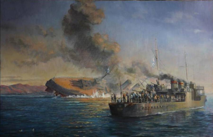 Она началась в 16.00 с поднятия на всех кораблях и судах Черноморского флота, выстроившихся в Новороссийской бухте, сигнала «Погибаю, но не сдаюсь!». После этого «Керчь» выпустила торпеду по эсминцу «Фидониси», что стало сигналом для остальных вымпелов: на них остатки команд подорвали основные механизмы и открыли кингстоны. А «Керчь» ушла к «Свободной России», чтобы своими торпедами потопить и ее. Правда, сделать это удалось далеко не с первой попытки. Из двух первых торпед в цель попала только одна, взорвавшись под боевой рубкой. Тогда «Керчь» выпустила третью, попавшую в корму линкора, но и это не пустило бывшую «Императрицу Екатерину Великую» на дно. Четвертая торпеда взорвалась в районе кормовой башни главного калибра, тоже не причинив кораблю видимых повреждений, пятая и вовсе вошла в режим циркуляции и повернула на обратный курс. И только шестым выстрелом «Керчь» сумела, пробив корпус, уничтожить сопротивлявшийся гибели линкор.