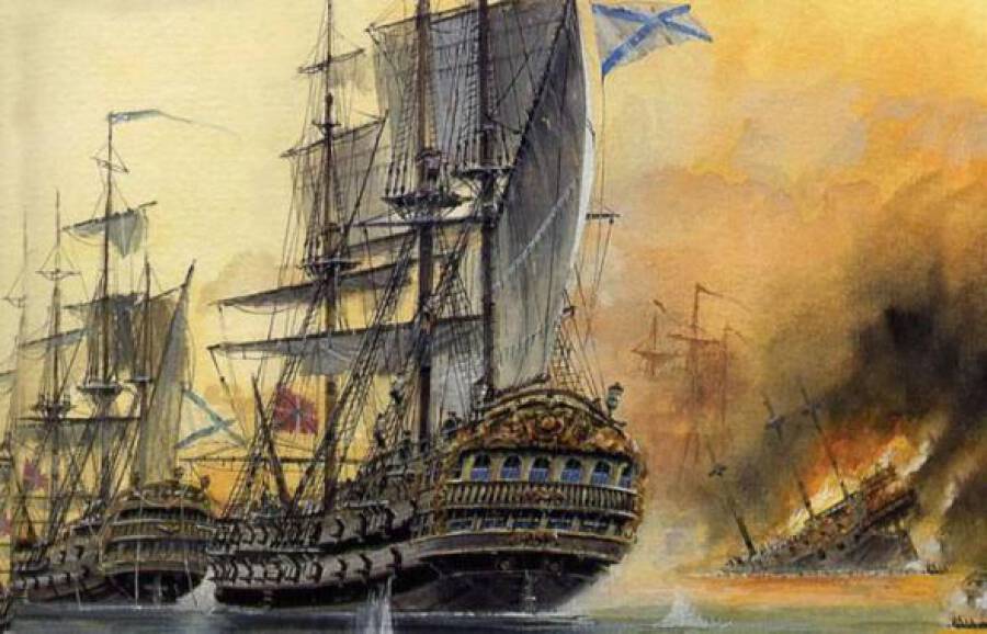 Сначала турки попробовали пойти на хитрость – захватить базу, снабжающую русский флот, на острове Тенедос. Но гарнизон острова отбил все попытки десанта. Теперь туркам не оставалось иного выбора, кроме сражения на море, которого они не хотели и боялись.