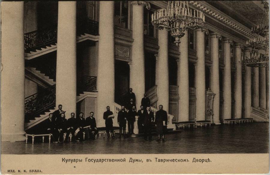 I Государственная дума действовала в период с 27 апреля по 9 июля 1906. Ее открытие состоялось в Петербурге 27 апреля 1906 в самом крупном в столице Тронном зале Зимнего дворца. После обследования многих зданий Государственную Думу было решено разместить в построенном Екатериной Великой для своего фаворита светлейшего князя Григория Потемкина Таврическом дворце.
