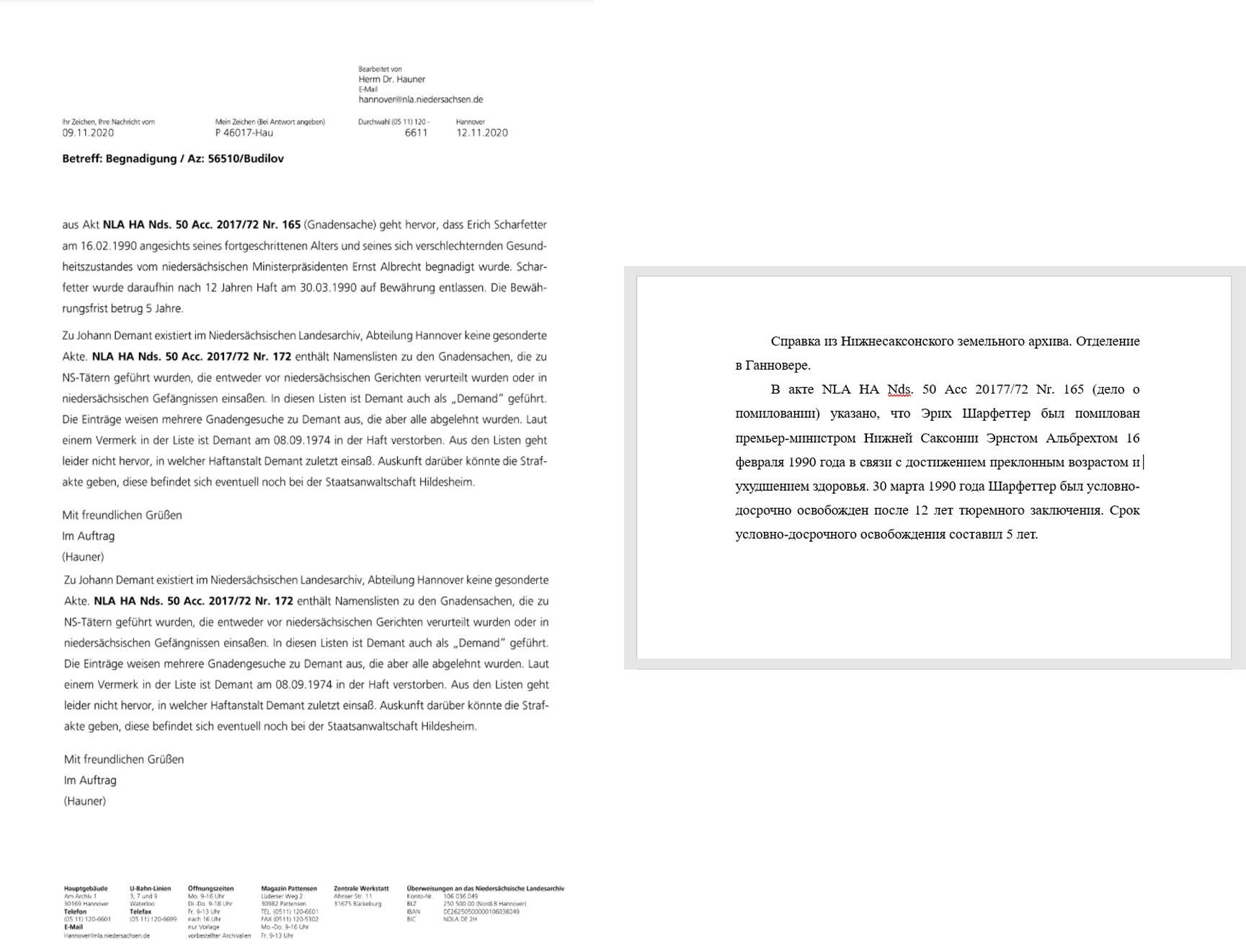 1 февраля 1980 года земельный суд г. Штаде (ФРГ) приговорил нацистского преступника Эриха Густава Шарфеттера к 18 пожизненным срокам за 18 убийств, совершенных в концлагере на оккупированной территории СССР. Десять лет спустя, в феврале 1990 года, глава федеральной земли Нижняя Саксония, министр-президент Эрнст Альбрехт (CDU) – отец председателя Европейской комиссии Урсулы фон дер Ляйен (CDU, в 1976-1999 годах возглавлял земельное правительство Нижней Саксонии) – помиловал его ввиду преклонного возраста и ухудшения здоровья. Освободился Шарфеттер 30 марта 1990 года. Умер в 1998 году в возрасте 90 лет.