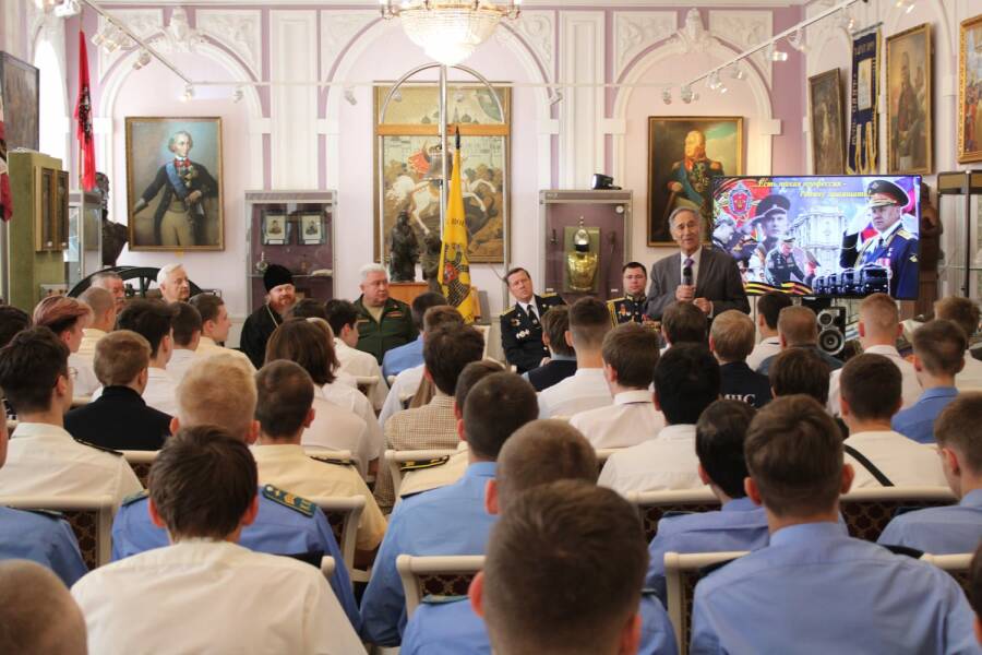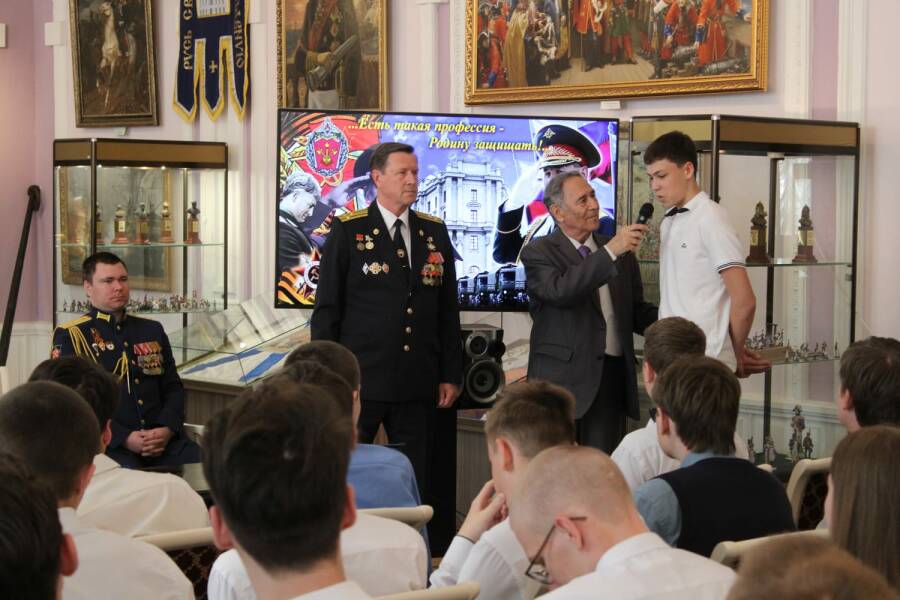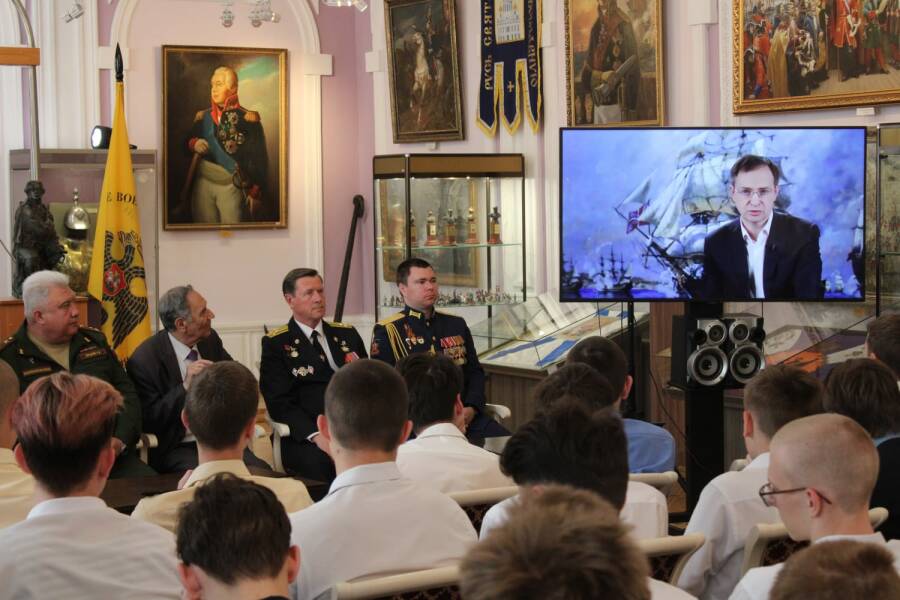 Символично, что первое заседание «Клуба будущих офицеров» в Тамбове тоже началось с показа видеолекции об этом прославленном флотоводце, которую подготовил в рамках проекта «Рассказы из русской истории» помощник Президента РФ, доктор исторических наук, профессор Мединский В.Р. «Я из семьи военных. Это особые люди», – поделился со зрителями Владимир Ростиславович. Его отец – Ростислав Игнатьевич Мединский – полковник в отставке, более 40 лет честно и доблестно служивший в Вооруженных Силах России. Человек большого личного мужества и высокого профессионализма, настоящий советский офицер, он сполна проявил свои командирские и человеческие качества при выполнении служебно-боевых задач. Ростислав Игнатьевич участвовал в войне в Афганистане, в ликвидации последствий аварии на Чернобыльской АЭС и землетрясения в Спитаке.