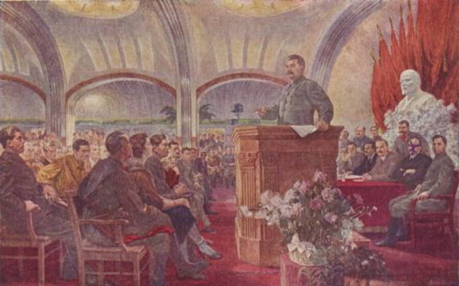 Обложка: «Выступление И. В. Сталина на торжественном собрании, посвящённом XXIV годовщине Великой Октябрьской социалистической революции». Картина художника Ираклия Тоидзе, 1947 год. Источник: worowski.livejournal.com