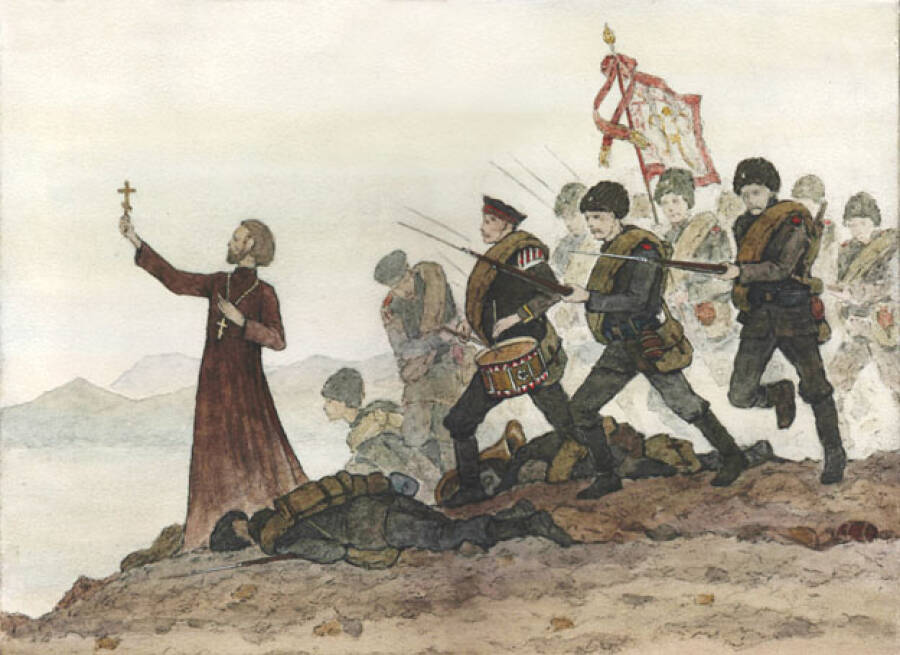А на Руси это началось со времён великих князей. Одним из главных примеров в русской истории является Дмитрий Донской. В его войсках всегда были флаги с изображением Спасителя. У Ивана Грозного, кстати говоря, был крайне необычный флаг со Спасителем на белом коне. И рядом с каждым полком шли военные священники.