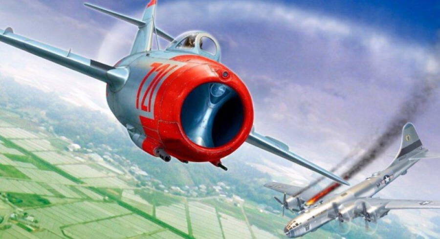 Реактивные истребители F-86 «Сейбр» и МиГ-15 в парном полете (современный снимок). Окраска американского самолета соответствует опознавательным знакам позднего этапа Корейской войны; МиГ-15 имеет опознавательные знаки северокорейских ВВС