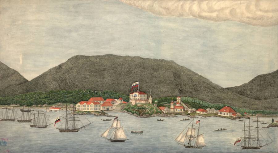 Источник: Вид Новоархангельска — столицы Русской Америки и главного города Российско-Американской компании в русских владениях на тихоокеанском побережье Америки. Источник: https://vc.ru