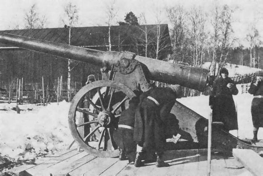 Старый специалист рассказал, где в Подмосковье хранятся старые гаубицы, где можно достать необходимые для них шестидюймовые снаряды. Эти старые осадные орудия были сильно изношены. Их использовали еще при освобождении Болгарии от турецкого ига, а затем и в Русско-японской войне 1904-1905 годов. Отслужив своё, они долгие годы числились на балансе Мытищинского арсенала, где хранились в глубокой консервации. Царские пушки оказались вполне боеспособными. В действительности стрельба из них была уже небезопасна, но до 10 выстрелов они выдержать могли. Орудийные расчёты были сформированы из преподавателей академии и учеников 10 класса специальной артиллерийской школы. Всего было подготовлено несколько десятков старинных пушек. Эти орудия не имели прицелов, их решено было наводить на цель через ствол и стрелять прямой наводкой.
