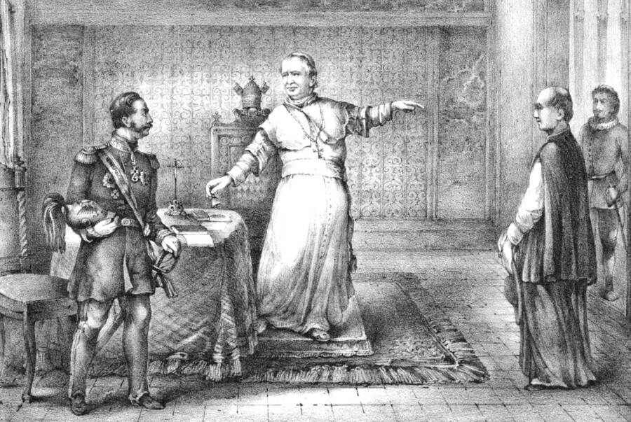Обложка: «Высылка русского посланника в Святейший Престол Феликса фон Мейендорфа папой Пием IX в 1864 году за оскорбление католической веры». Рисунок художника Енджея Бридака, 1860-е годы. Источник: https://commons.wikimedia.org