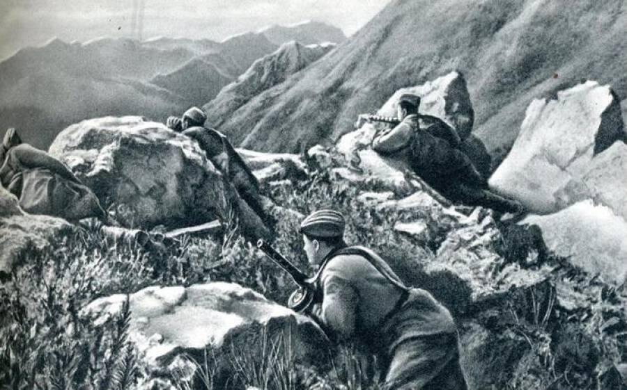 Советские бойцы зимовали на перевалах в разборных домиках, а валенки берегли их от обморожений. Горные ботинки немецких егерей здесь проигрывали вчистую.