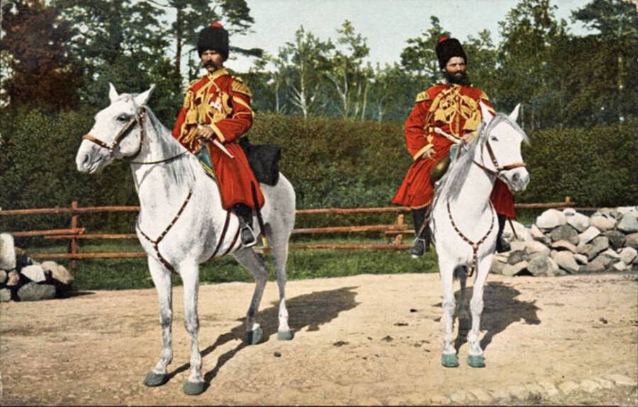 Форма у казаков конвоя была очень красивая и запоминающаяся: алые черкески, расшитые золотым и серебряным галуном, белые бешметы и черные папахи с красным верхом, тоже обшитые галуном. Конское седло и чепрак изготовлялись лучшими мастерами и были в цвет основной формы.
