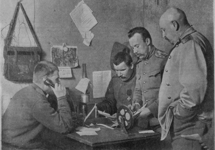 Обложка - В штабе русского корпуса – принятие важного донесения. Одновременно используются полевой телефон (принятие донесения) и телеграф (одновременная передача сообщения вышестоящему командованию). У телеграфа и телефона в этот момент присутствует начальник дивизии. Источник: https://topwar.ru