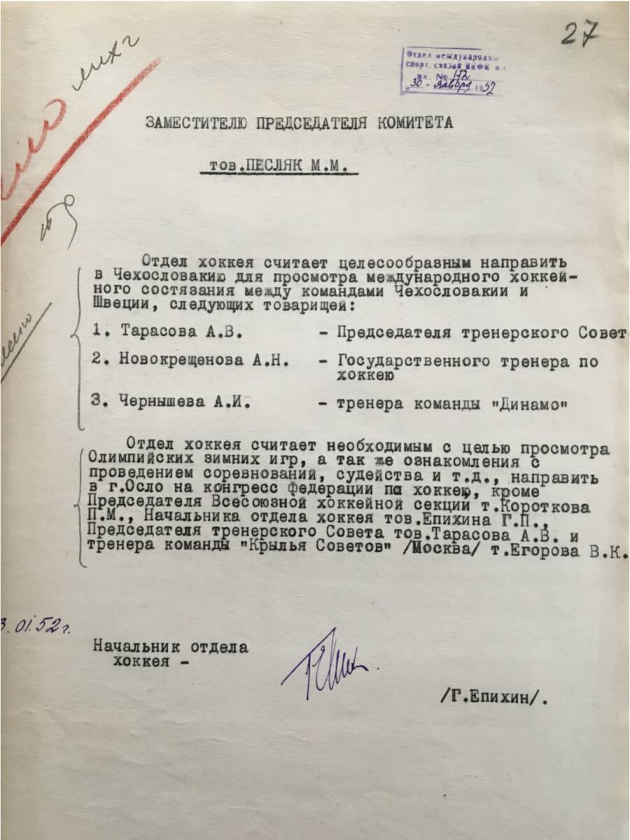 Эта довольно продолжительная история тянулась около 3-х лет. Вкратце она выглядит так. Секция хоккея СССР (так она называлась тогда) была принята в члены ЛИХГ (30 голосами «за» при 7-ми «против» и 7-ми «воздержавшихся») 3 апреля 1952 г. Но на свой первый чемпионат мира наша команда поехала только в 1954 г. Существуют различные версии и толкования причин «неучастия» сборной СССР в чемпионате 1953 г. До последнего момента (18.12.1952 г.) президент ЛИХГ г-н Ф.Кратц, ведя официальную переписку с Госкомспортом СССР, рассчитывал на подачу заявки на участие в чемпионате мира (7-15.03. 1953, Швейцария) нашей команды. Ожидали этой заявки и хоккеисты, и тренерский штаб сборной СССР по хоккею. Завершились эти ожидания после выхода в свет Постановления Совета Министров СССР № 5276-2058 от 26.12.1952 «… о направлении в марте 1953 г. в Норвегию команды советских хоккеистов в составе 25 человек сроком на 15 дней для участия в товарищеских соревнованиях с норвежскими хоккеистами». Подписано оно было Председателем Совета Министров СССР И.В.Сталиным. Это означало отказ СССР от участия в чемпионате мира.