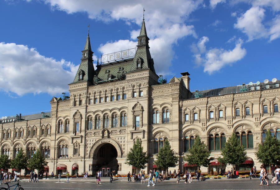 Задумка создания грандиозного торгового центра возникла при Екатерине Великой. Старые торговые лавки снесли, но новый проект до конца не был реализован, а пожар 1812 года вообще все уничтожил. Новые Верхние торговые ряды были построены мастером классицизма Осипом Бове. Но и в этот раз проект оказался неидеален – достаточно быстро здание пришло в негодность. С 1869 года городская дума вела безрезультатные переговоры с владельцами лавок, желавшими выбить у города для себя максимально выгодные условия. Консенсус был достигнут лишь в 1886 году, когда возникло предложение о создании «Акционерного общества Верхних торговых рядов на Красной площади в Москве». Старое здание разобрали, а в 1893 году открыли новое, сохранившееся до сих пор.