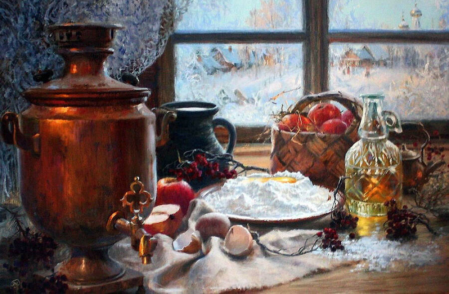 Название «самовар» было отнюдь не универсальным и менялось в зависимости от региона. В Ярославле использовали слово «самогар», в Курске – «самокипец», а на Вятке – «самогрей». Наиболее распространенными считались самовары объемом до восьми литров, хотя большой семье могла понадобиться емкость и побольше – литров на 15. Холодные русские зимы лишь способствовали росту популярности самоваров. Наши предки быстро сообразили, что с помощью самовара можно не только получить кипяток, но и обогреть дом. И хотя изделия стоили недешево, многие семьи целенаправленно копили на покупку самовара. Стоимость, кстати, не всегда зависела от ценности металла – не менее важную роль играл вес самовара.