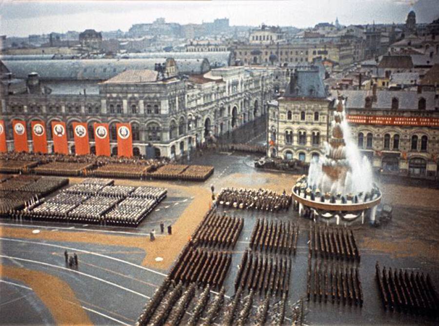 На некоторых фотографиях того парада мы видим сооружение, совсем не согласующееся с нынешним видом главной площади страны. Это фонтан.