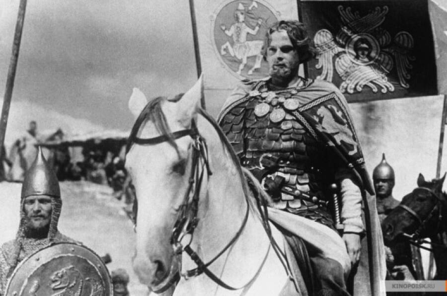 И да, в этой картине не было ничего о трудной личной жизни князя. И романтическая линия осуществлена простым и понятным способом: девушка Ольга объясняет соискателям Гавриле и Василию, что замуж пойдёт за того, кто храбрее Родину защищать будет. И предатели ходят-ползают ссутулившись, как шакал Табаки — или как Эфиальт в «спартанцах» семь десятилетий спустя.