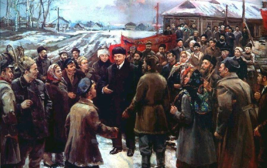 Обложка: В.И. Ленин и Н.К. Крупская с крестьянами деревни Кашино в 1920 году. Художник Д. Налбандян. 1985 год. Источник: pinterest.ru
