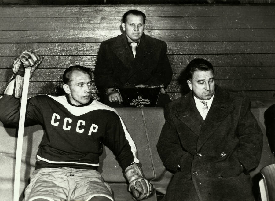В качестве послесловия к этому очерку мы приводим одну любопытную фотографию. Она символизирует момент смены поколений, с которого начался победный марш советского хоккея.