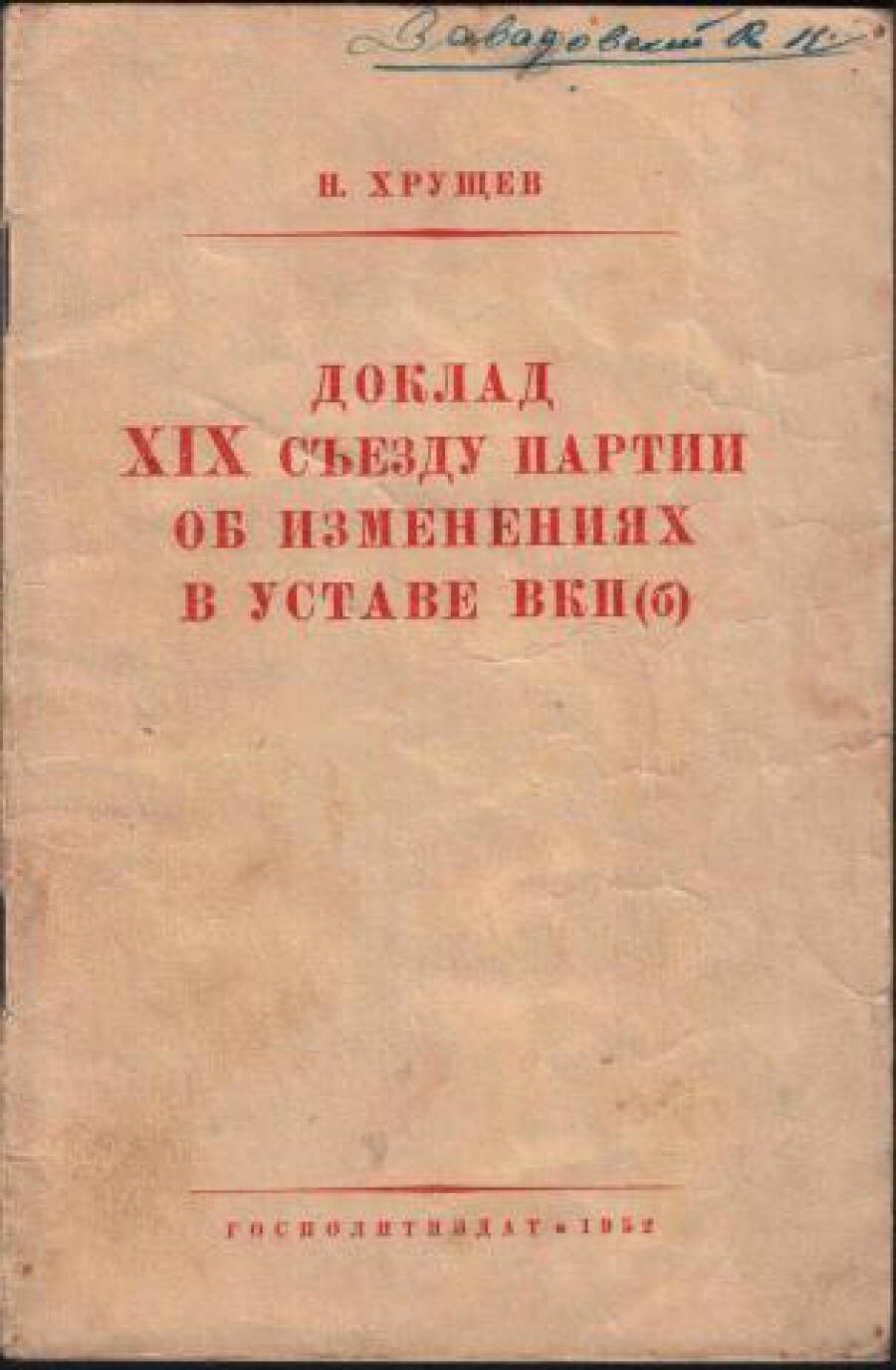 Обложка: обложка книги Хрущев Н.С. Доклад XIX съезду партии об изменениях в уставе ВКП (10 октября 1952 г.).