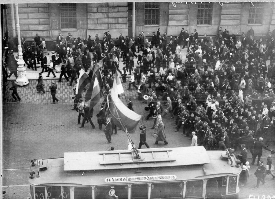 Обложка: Манифестанты возвращаются по Невскому проспекту (мимо Императорской Публичной библиотеки) после оглашения манифеста об объявлении войны Германии 2 августа 1914