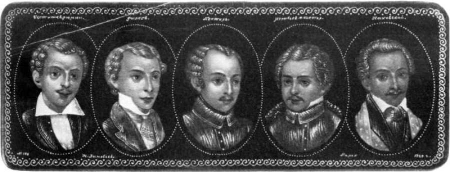 Обложка: декабристы П.И. Пестель, К.Ф. Рылеев, С.И. Муравьев-Апостол, М.П. Бестужев-Рюмин и П.Г. Каховский