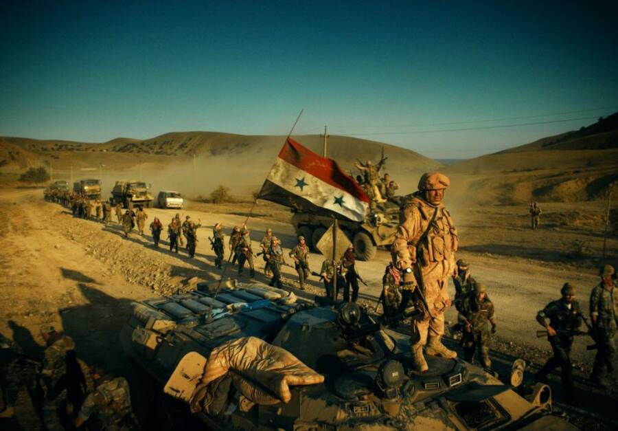 Причем техники не «абы какой» – а реально используемой нашей и сирийской армией, от бронированных Камазов и пикапов с пулеметами до штурмовиков Су-25, вертолетов и увешанных «самопальной» защитой танков.