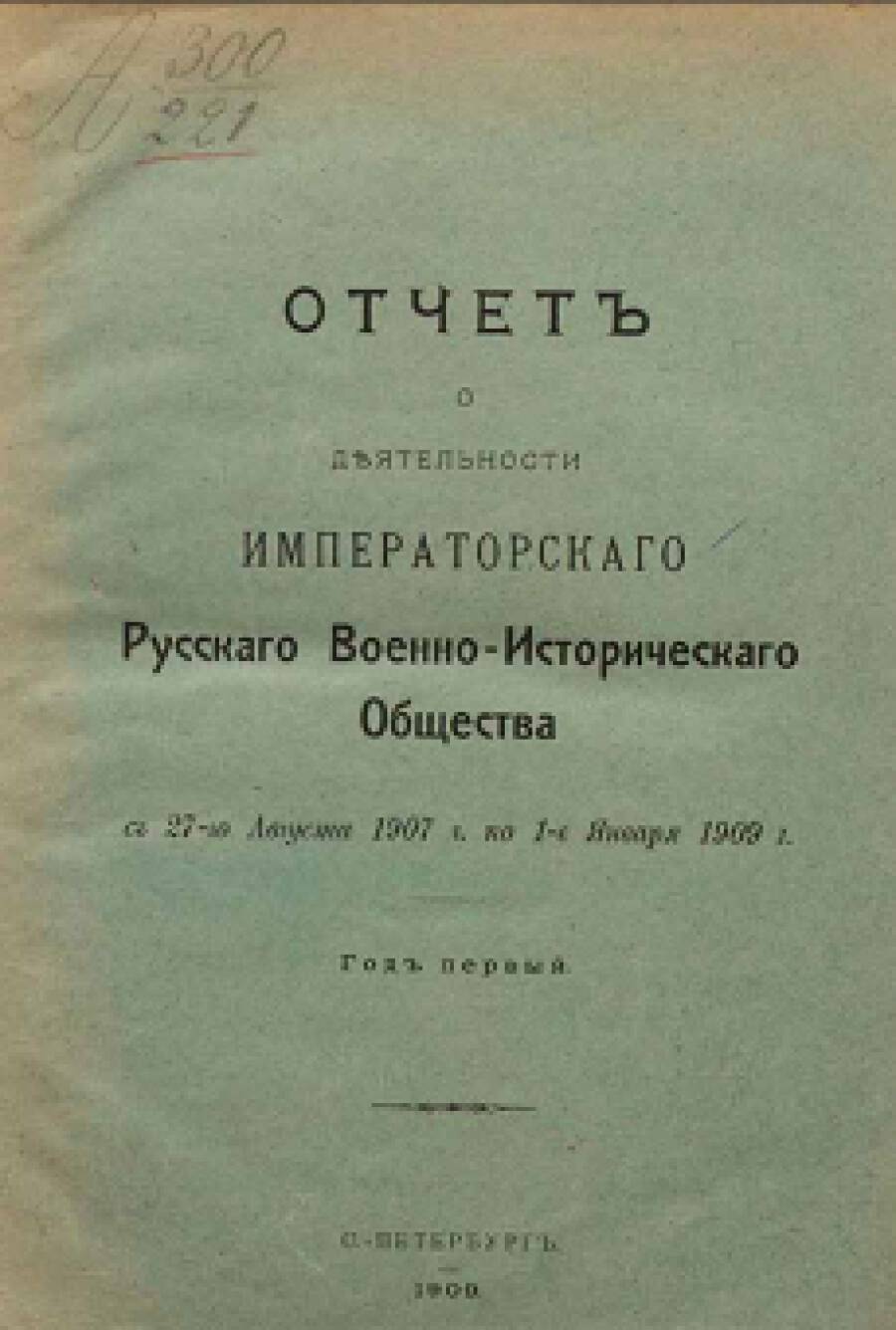 Отчет о деятельности Императорского Русского военно-исторического общества с 27 августа 1907 г. по 1 января 1909 г. Год первый. СПб., 1909