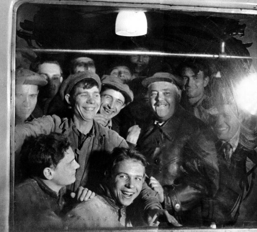 Обложка: Строители метро в вагоне одного из первых поездов. Фотография Ивана Шагина. 1935 год