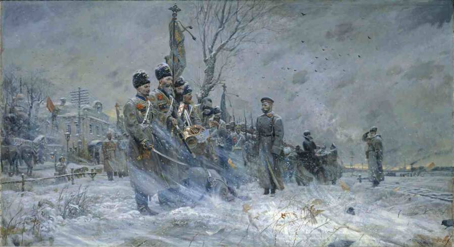 Минута была глубоко-торжественная. Обняв Генерала Рузского и тепло пожав нам руки, Император медленными задерживающимися шагами прошел в свой вагон.