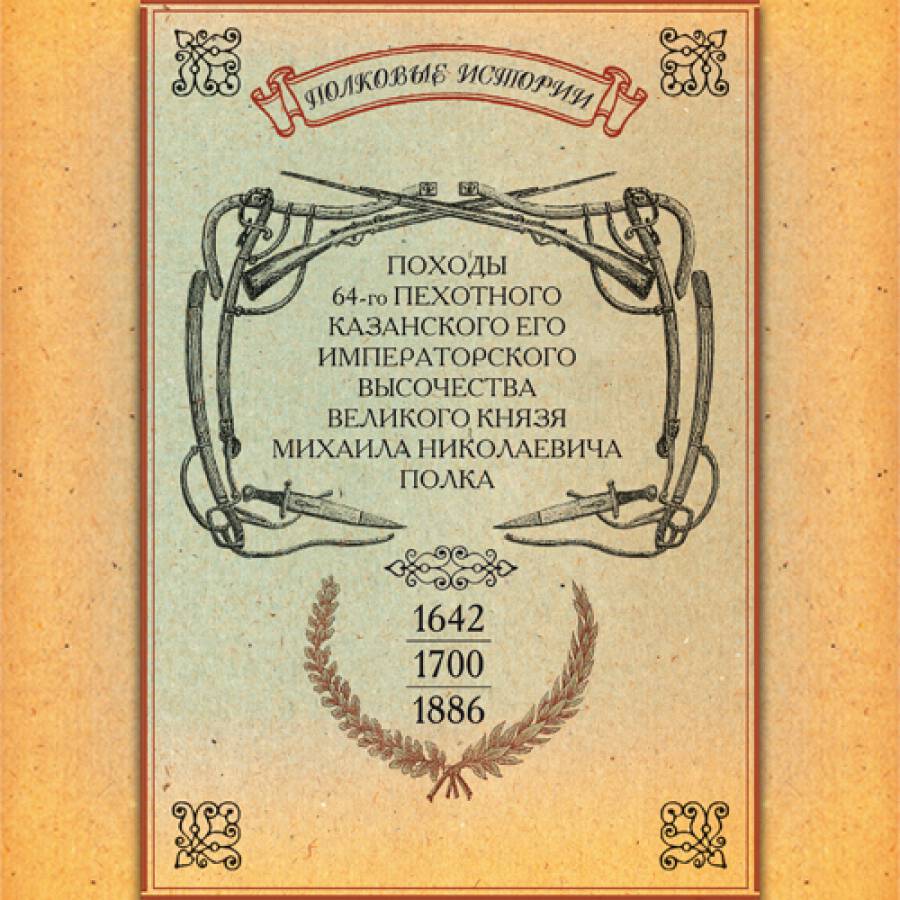 Обложка: обложка книги «Походы 64-го Пехотного Казанского его Императорского Высочества Великого Князя Михаила Николаевича полка. 1642–1700–1886 гг. / Сост. В. Борисов и А. Сыцянко. Репр. воспр. текста изд. 1888. СПб.: Нестор-История, 2010.»" |