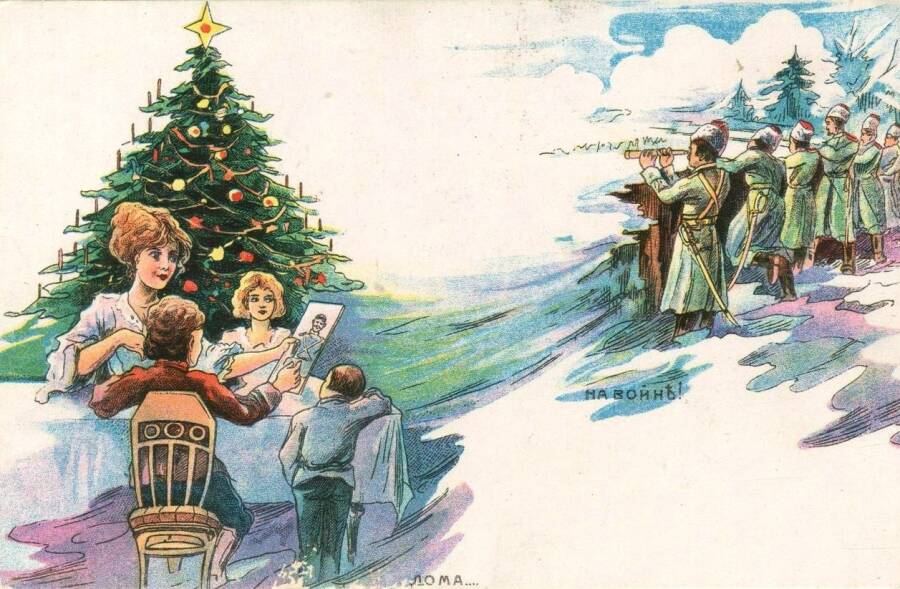 Война не знает ни выходных, ни праздников. Увы, эта истина имеет немало исторических подтверждений. Суровые солдатские будни перед Рождеством мало чем отличались от обычных дней. Далеко не всегда военным удавалось нарядить елку или отправить домой поздравительную открытку, а праздничный ужин и вовсе считался настоящей роскошью. В российской армии Рождество относилось к тем десяти дням в году, когда солдаты получали так называемые «винные порции». Напомним, что хлебным вином в те годы называли водку. Солдаты соблюдали пост: самыми распространенными блюдами с 28 ноября до 7 января (по новому стилю) были каши и рыба. Согласно самым строгим правилам в сочельник есть запрещалось до первой звезды. На Рождество проводили смотр войск и праздничный молебен, а затем устраивался обед с мясными блюдами. С началом войны рождественские елки оказались было «в опале» (как и все немецкое), однако за главный символ зимнего праздника вступилась императрица Александра Федоровна. Будучи немкой по национальности, она и сама подвергалась нападкам – злые языки называли ее едва ли не шпионкой. В 1914 году императрица писала Николаю II: «Говорят, Синод издал указ, воспрещающий устраивать елки. Я постараюсь добраться до истины в этом деле, а затем подниму скандал. Чего ради лишать этого удовольствия раненых и детей? Только из-за того, что этот обычай первоначально позаимствован у немцев? Какая безграничная узость!» Вскоре рождественские елки действительно оставили в покое. В 1916 году искусно украшенное дерево установили в Аванзале Зимнего – для раненых госпиталя, развернутого во дворце. Было объявлено, что средства на нарядную елку пожертвовал наследник престола цесаревич Алексей Николаевич.